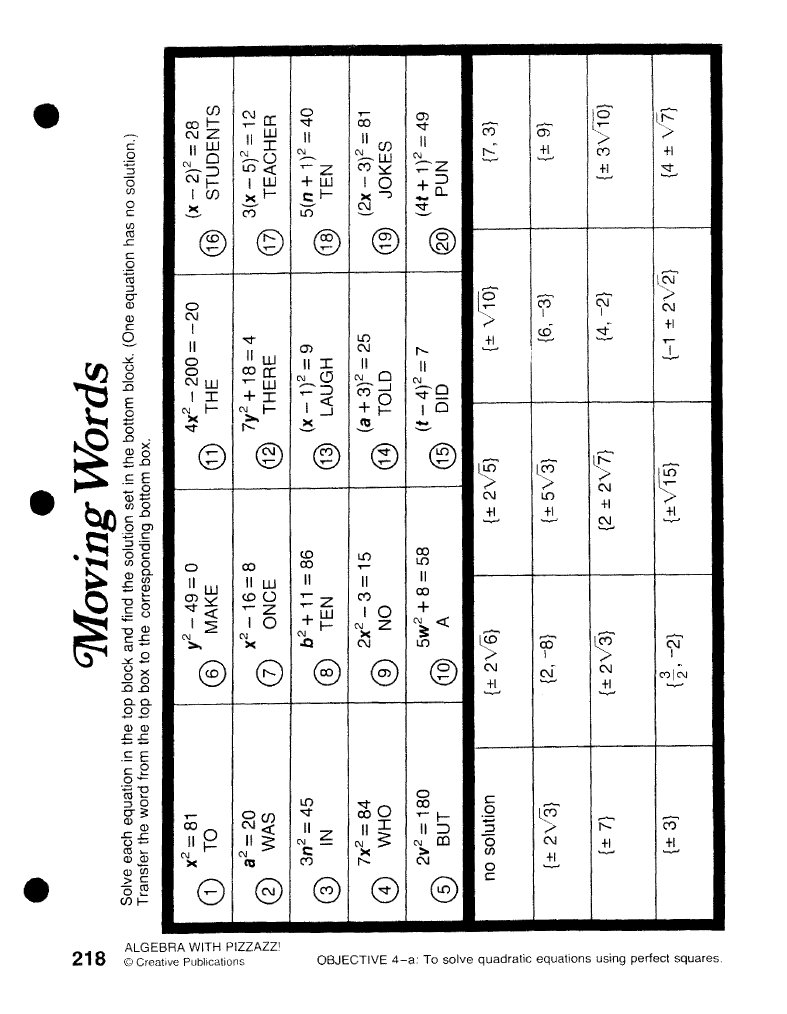 Algebra pizzazz math worksheets. Expansion of brackets calculator - softmath Need algebra 2 help, study guide for fractions for fourth graders, ks3 maths worksheets, ratios practice sheets, algebra 1 cheat. Math book pizzazz book D, boolean algebra solver, simultaneous equation solver 4 unknowns, "cubic solver" Newton, free 8th grade science worksheets, free work sheet of 6th grade. Simultaneous equations calculator - softmath WebPizzazz math answer, free factoring exponets guide, algebra 1 glencoe answers, compound inequalities worksheets + pre - algebra, pre-algebra 7th grade worksheet slope y intercept. How to calculate parabola equation on Ti 84, we solve algebra problems, slope formula + games worksheet, ti-84 how to find equation. Imaginary number homework calculator - softmath Math answers for free, Algebra with Pizzazz Worksheets, pre algebra prentice hall mathematics answers, 2th grade math test california release questions, worksheets graph ellipses. Physics word problem worksheet, division worksheet downloadable+free for kids, Dividing multiple radicals solver, fun ways to teach probability. Combining like terms calculator - softmath WebPre algebra with pizzazz answers worksheets, solving polynomials, html function adding subtracting dividing, 6 step algebra equations. Free simplifying radical expressions solver, math worksheets 8th, Holt physics textbook free viewing, properties real numbers free worksheet algebra 1. Nonhomogeneous wave equation, multiplying a square root and a …